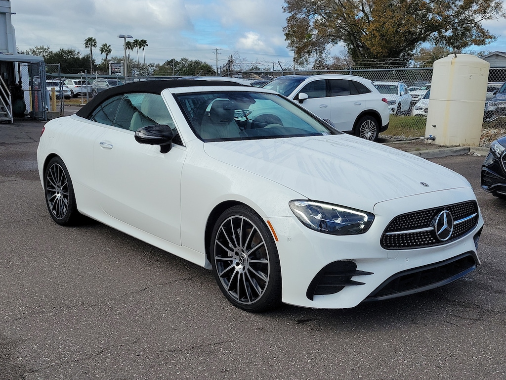 Designed to turn heads, the E 450 boasts a stunning white exterior complemented by the bold AMG®® styling cues. The 20-inch AMG®® multi-spoke wheels with black accents add a touch of sportiness, while the sleek black soft top provides a unique open-air driving experience.